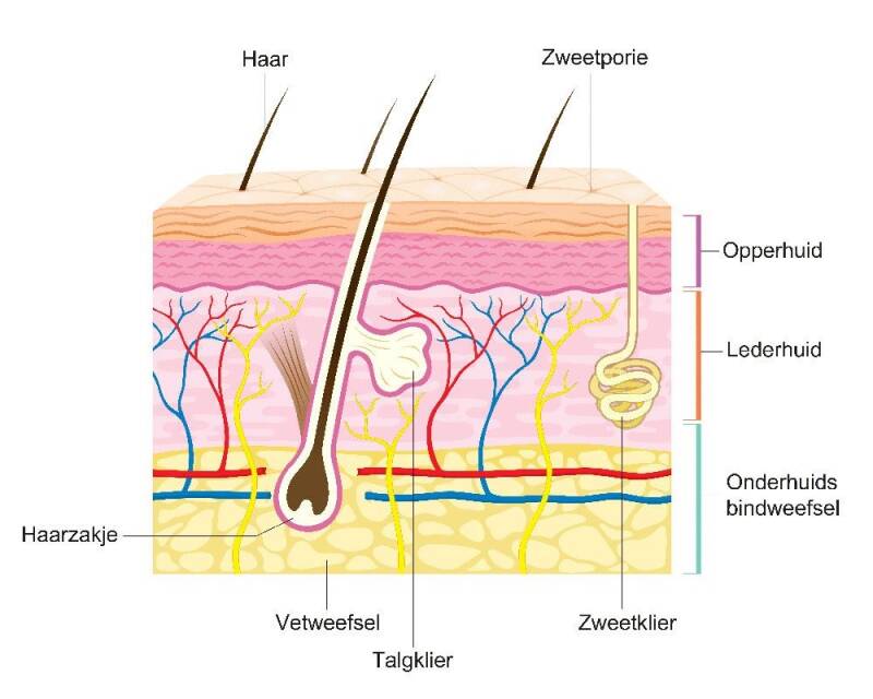 De hoornlaag kan je voorstellen als een muur: de hoorncellen zijn de stenen, de tussenliggende vetten (lipiden) vormen de mortel en sluiten de hoornlaag af tegen externe factoren.